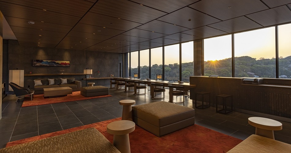 客室はスタイリッシュな和モダン洋室で、広々としたお部屋は、随所に木のぬくもりあふれる設え。山鹿灯篭をイメージした組子は、細部まで自然の素材にこだわっています。ベットは品質の高さで人気のシモンズ社製を採用しています。