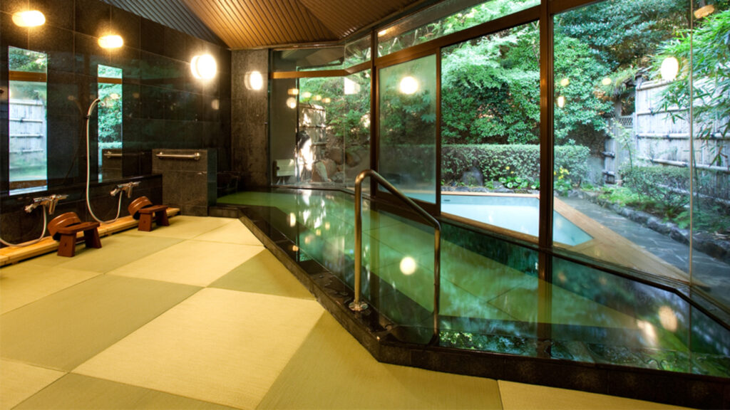 「那古井館別邸 玉響TAMAYURA」は、1300年間湧き続けている溢れ出す湯齢1300年の名湯を24時間存分に楽しめるという伝説があります。ここ玉響だけは玉名温泉で唯一pH8.6のアルカリ泉です。「美肌の湯」とも言われており、地下400mより汲み上げております。